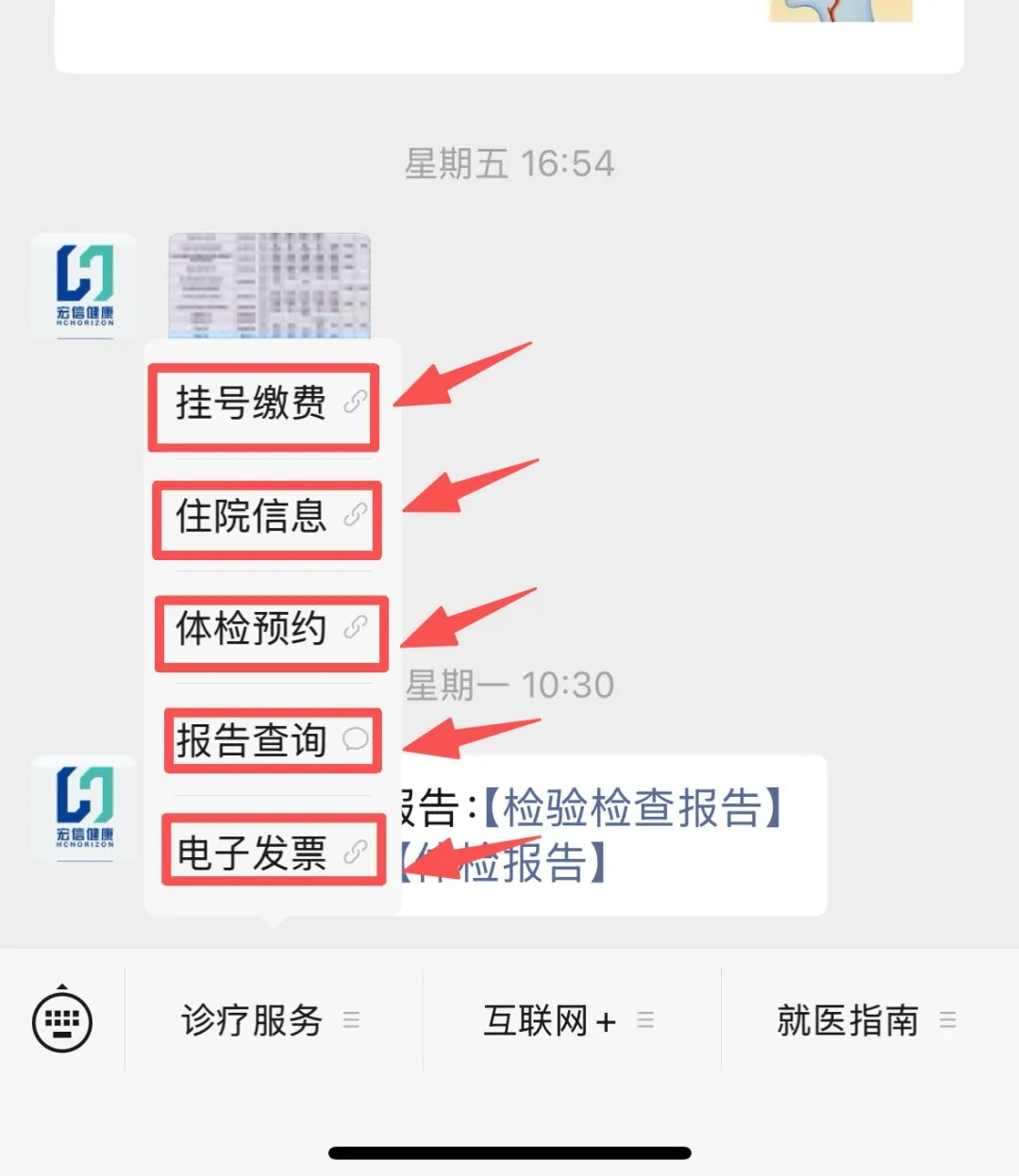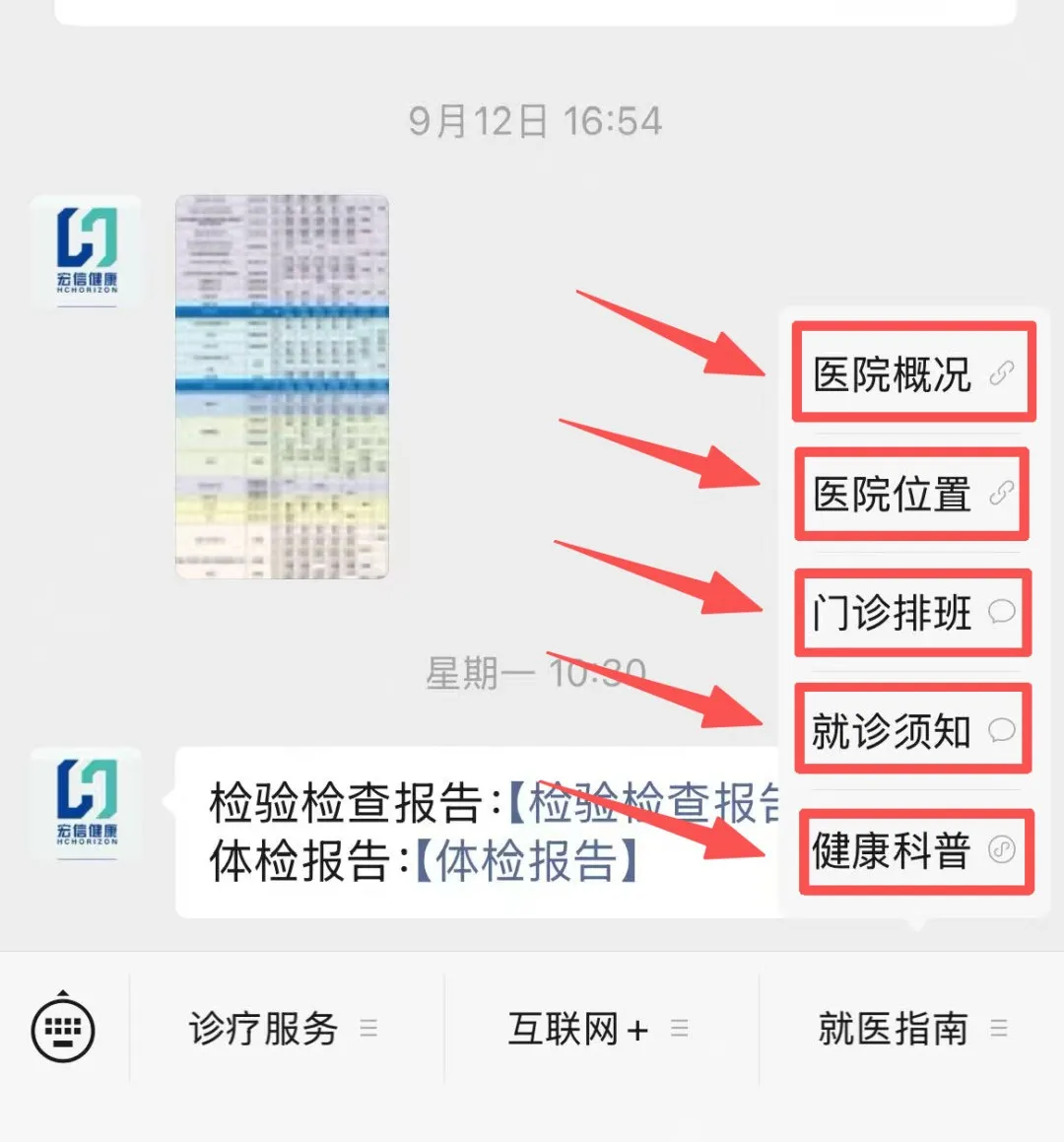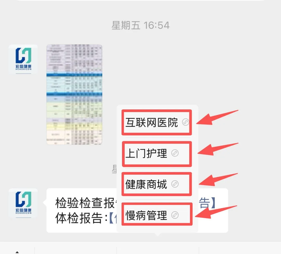 4.报告查询:点击报告查询后,会收到检查检验报告、体检报告以及云胶片的消息,点击相应报告文字都能直接跳便捷查看;