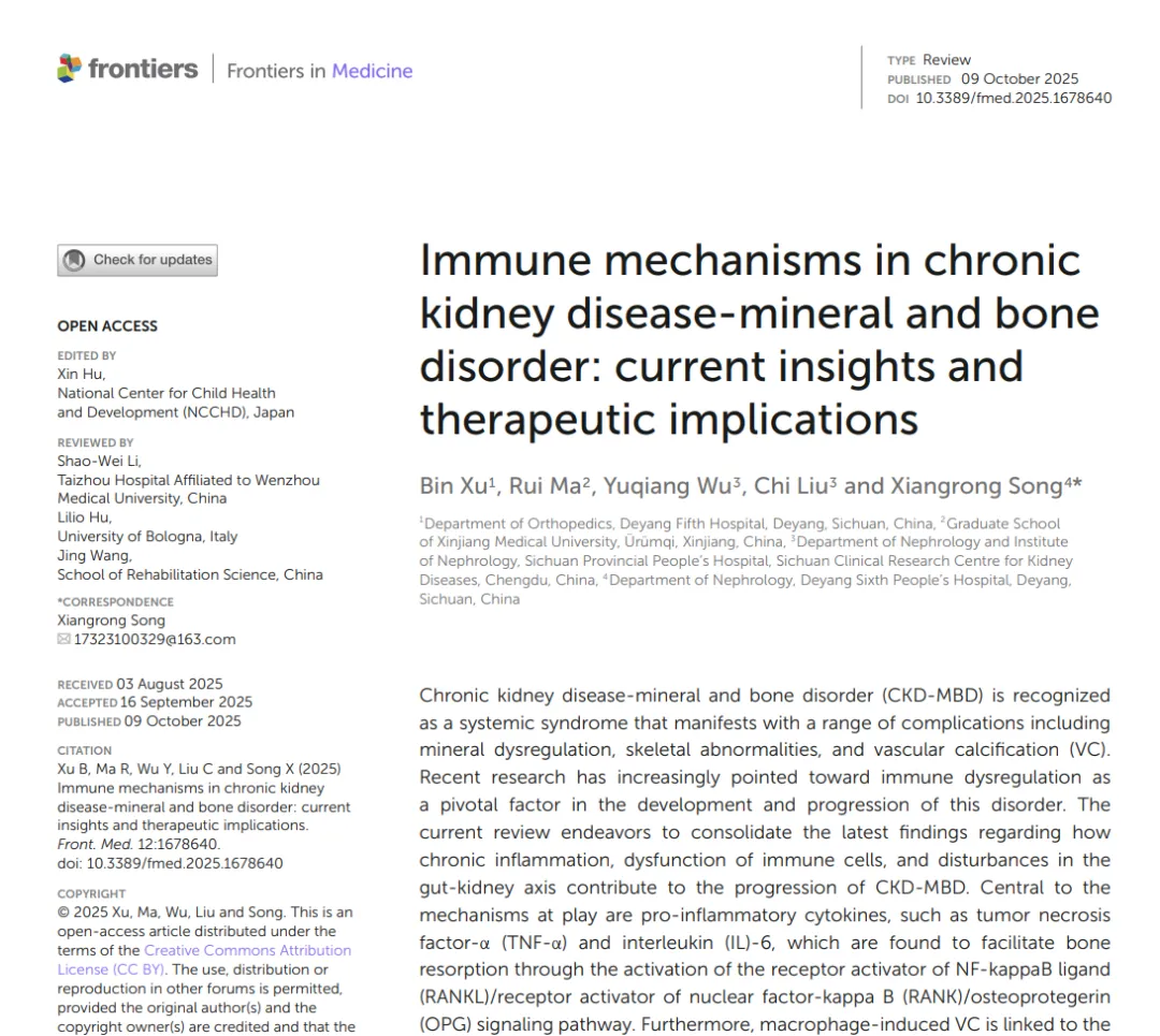 近日,我院骨科在国际知名SCI期刊《Frontiers in Medicine》发表了题为"Immune mechanisms in chronic kidney disease-mineral and bone disorder: Current insights and therapeutic implications "的一篇关于骨异常与CKD免疫机制相关的研究性论文。该期刊为JCR Q1区,中科院3区,近3年影响因子3.3,最新影响因子为3.0。该论文第一作者是我院骨科徐斌主任医师,此论文正式发表收录于SCI期刊论文,为我院首篇,实现了“零”的突破。